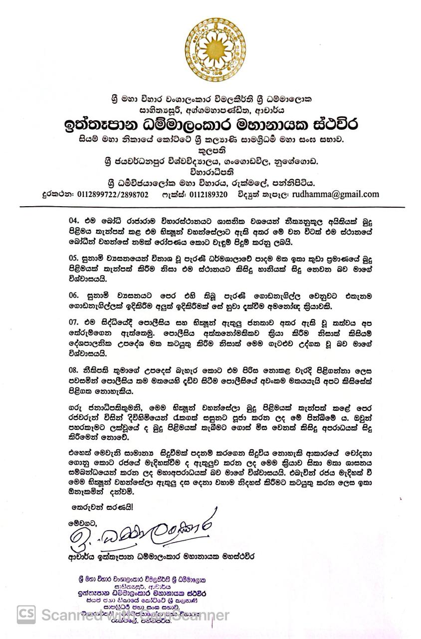 සිද්ධිය සම්බන්ධයෙන් ජනමාධ්යවලින් දැනගත් තොරතුරුත් මහාවිහාරවංශික කෝට්ටේ ශ්රී කල්යාණි සාමග්රිධර්ම මහා සංඝ සභාවේ නියෝජිත පිරිසක් එම ස්ථානයට යැවීමෙන් පසුව දැනගත් කරුණු මත ලිපිය සටහන් කළ බවයි එහි දැක්වෙන්නේ.