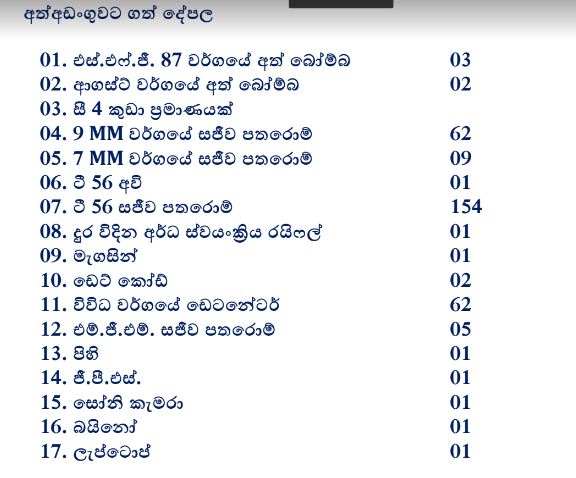 එස්.එෆ්.ජී 87 වර්ගයේ අත්බෝම්බ 3 ක්, සී ෆෝ කුඩා ප්රමාණයක්, සජීවි පතරොම් විශාල ප්රමාණයක්, දුරවිදින රයිෆලයක් ඇතුළු නීති විරෝධී අවි ආයුධ රැසක් ඒ අතරවන බව පොලිස් මාධ්ය ප්රකාශක කාර්යාලය සඳහන් කළා.