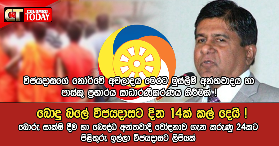 මුස්ලිම් ජනතාවට එරෙහිව අන්තවාදය පැතිරවීම සදහා බොදුබල සේනා සංවිධානයට හා පූජ්ය ගලගොඩඅත්තේ ඥාණසාර හිමියන්ට නෝර්වේ රාජ්ය යෙන් මුදල් දුන් බවට තමා කළේ යැයි කියන ප්රකාශය මුළුමනින්ම සාවද්ය බව හිටපු පාර්ලිමේන්තු මන්ත්රී විජේදාස රාජපක්ෂ මහතා පවසනවා.