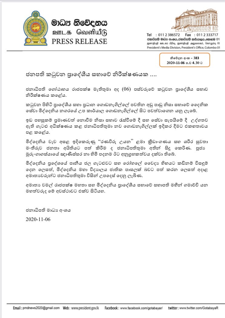 (06.11.2020 – 17:48 +0530 – hirunews.lk/sinhala)
